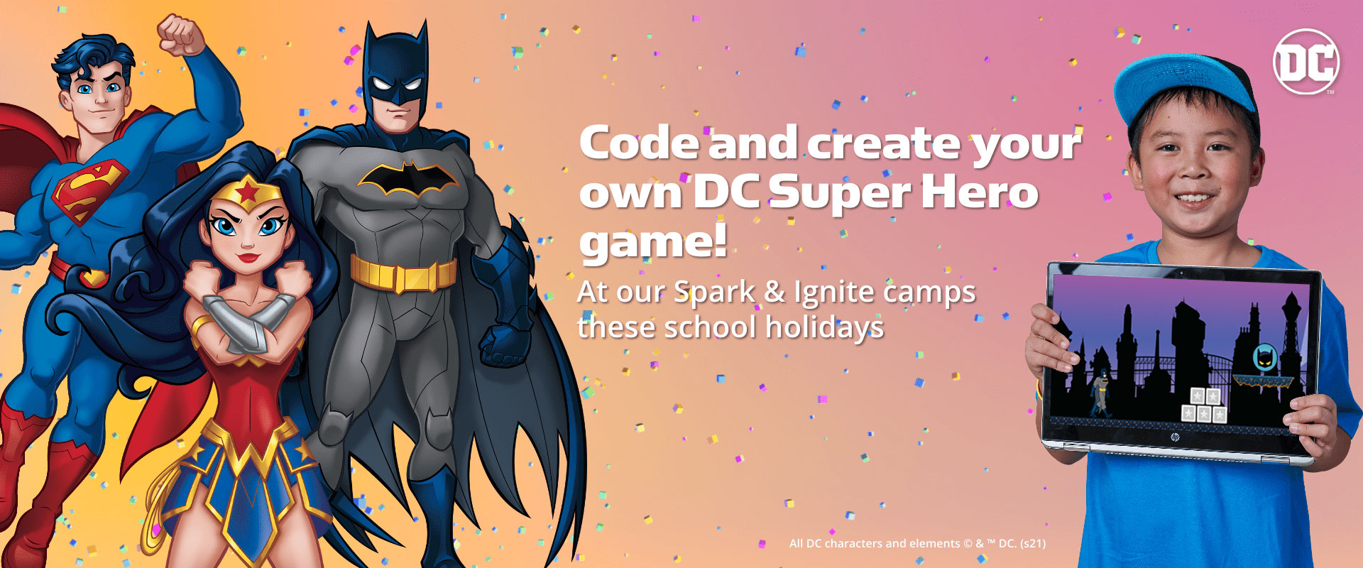 For the last time these school holidays your child can design, code and create their very own DC Super Hero game in our Spark and Ignite camps. They can choose from DC favourites BATMAN, WONDER WOMAN and SUPERMAN, and design their own adventure app using character themed backgrounds and collectibles, and then bring their game to life via drag and drop code or JavaScript. Hurry and get in before they leave Code Camp!